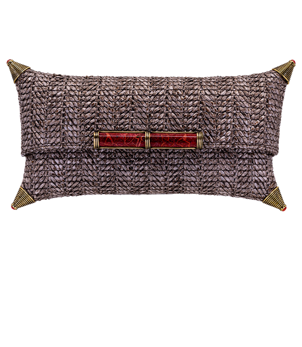 The Viola clutch in this version is handmade in Portugal out of dark taupe colored straw effect fabric, embellished by a striking horizontal bar detail featuring a deep red stone centerpiece framed in gold-tone brass. The brass corners are studded with 6mm red resin stones. Lined with cappuccino colored suede. Comes in its own dust bag.