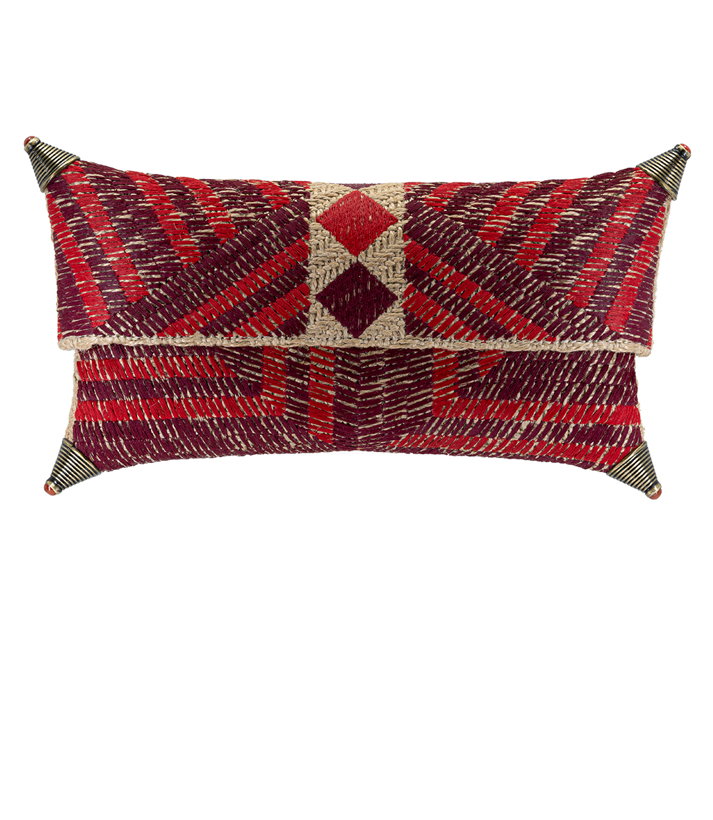 The Rochela clutch, in this version, is crafted in Portugal in an intricate, woven geometric pattern featuring diagonal lines and chevrons, in contrasting shades of red and burgundy. The corners are embellished by 6mm red agate stones set in gold tone metal. Lined in cappuccino colored suede. Comes in its own dust bag.