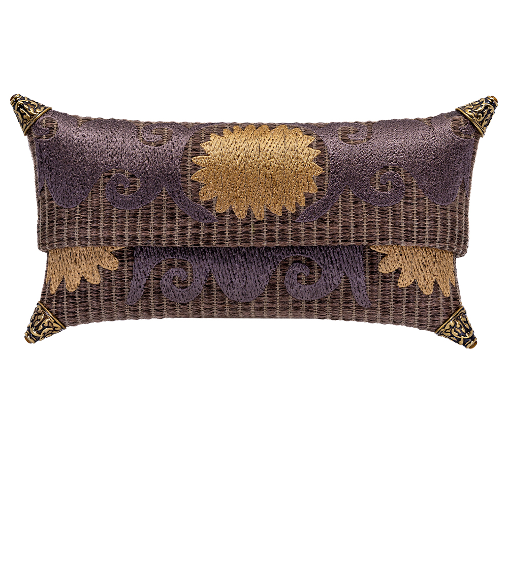 This version of the Cora Clutch is handmade in Portugal out of soft earth colored striped embroidered fabric, embellished with brass corners of middle eastern inspiration, studded with 6mm tiger eye stones. Lined in cappuccino colored suede. Comes in its own dust bag.