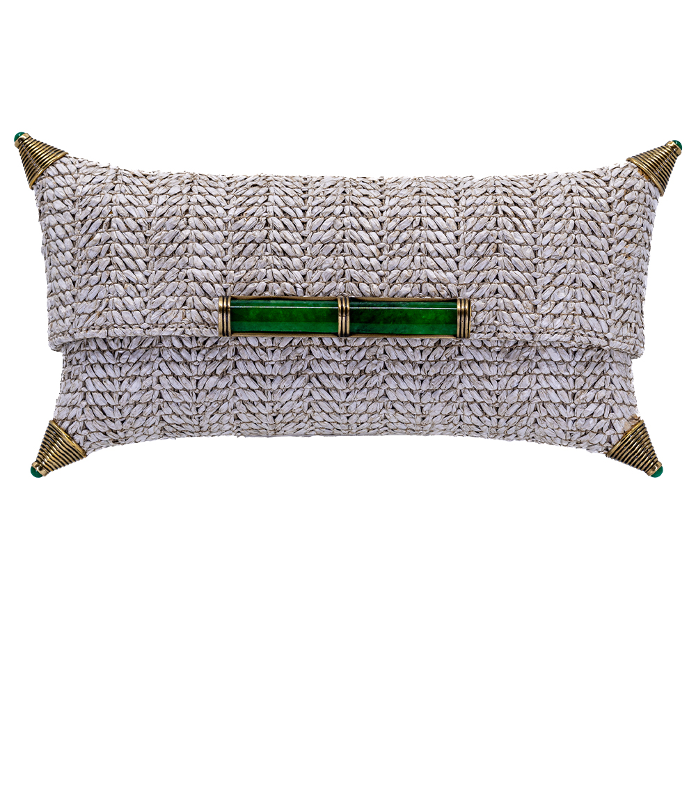The Viola clutch in this version is handmade in Portugal out of off white straw effect fabric, embellished by a striking horizontal bar detail featuring a green quartz stone centerpiece framed in gold-tone brass. The brass corners are studded with 6mm malachite stones. Lined with cappuccino colored suede. Comes in its own dust bag.