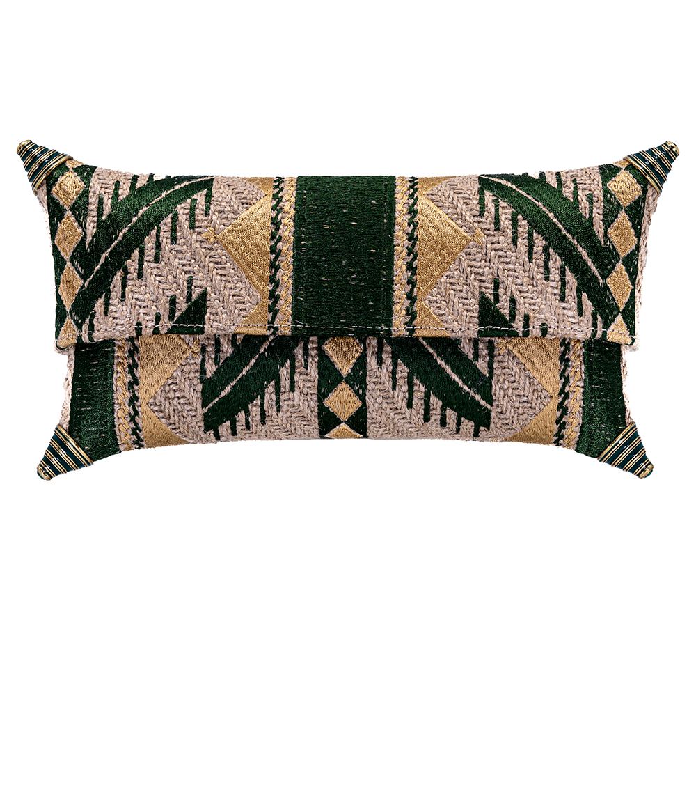 The Martha clutch, in this version, is handmade in Portugal out of 100% jute, embroidered in deep green and gold tones in a striking geometric pattern. The textured base beautifully contrasts with the embroidered angular motifs, creating a piece that feels both artisanal and contemporary. Embellished by brass enameled corners, studded with 6mm green agate stones. Lined with cappuccino colored suede. Comes in its own dust bag.