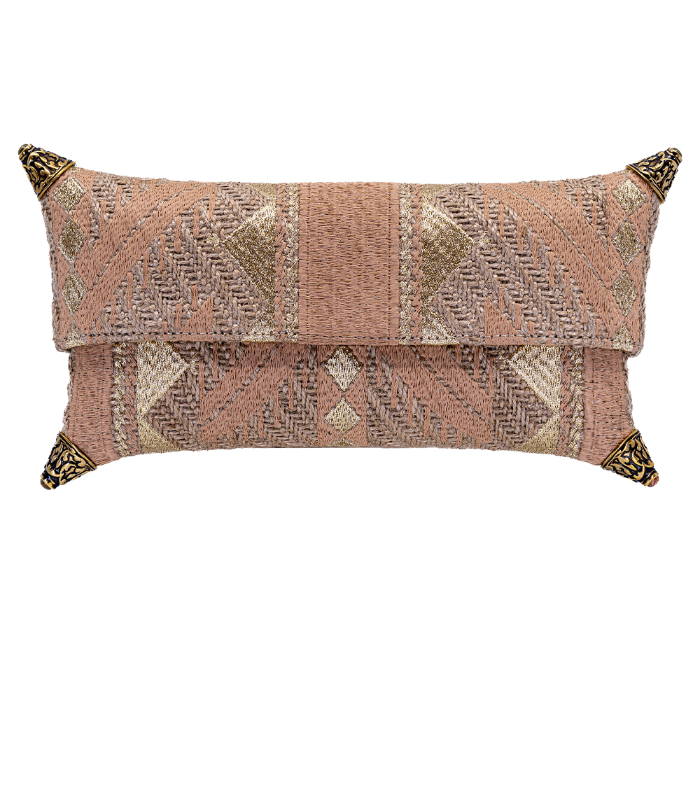 The Martha clutch, in this version, is handmade in Portugal out of 100% jute, embroidered in gold tones in a striking geometric pattern. The textured base beautifully contrasts with the embroidered angular motifs, creating a piece that feels both artisanal and contemporary. Embellished by brass corners, studded with 6mm tiger eye stones. Lined with cappuccino colored suede. Comes in its own dust bag.