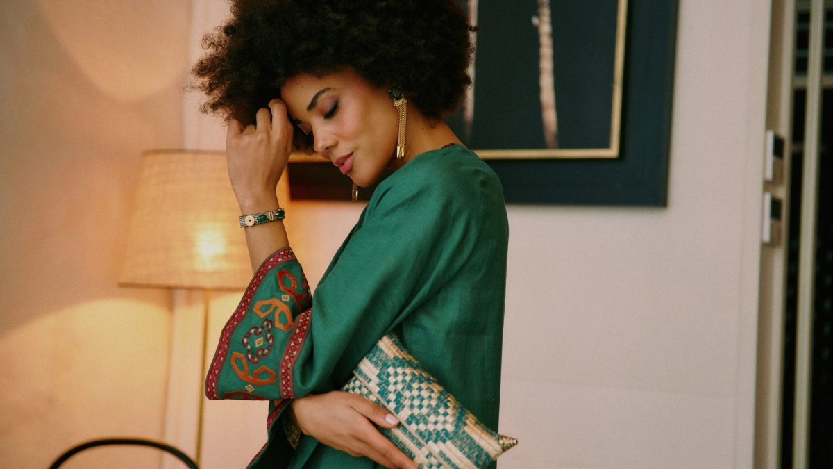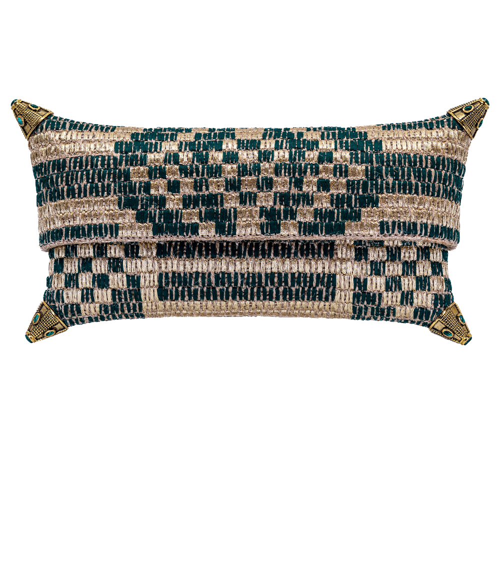 The Dorian clutch, in this version, combines rich emerald green with luminous gold tones in an intricate checker-inspired pattern. Handmade in Portugal out of 100% jute, it is embellished by brass corners of middle eastern inspiration, studded with 6mm green agate stones. Lined with taupe colored suede. Comes in its own dust bag.