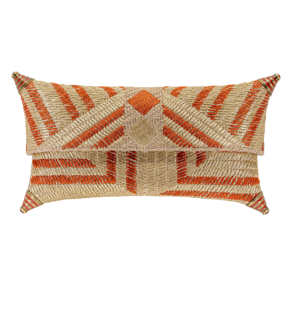 The Rochela Clutch in this version, is handmade in Portugal out of raffia embroidered in a geometric pattern in shades of coral and gold thread. Lined in suede and embellished by gold metal corners topped with 6mm round cabochon carnelian stones. Comes in its own dust bag.